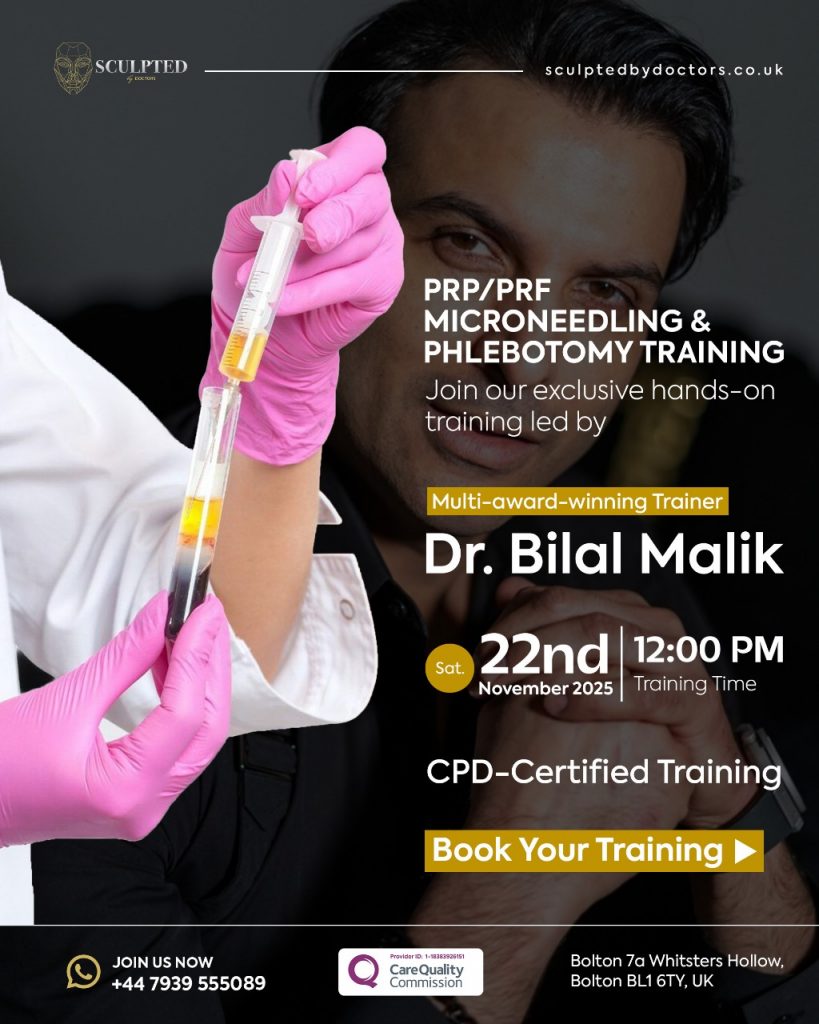 Join our exclusive hands-on training led by multi-award-winning trainer Dr. Bilal Malik and learn how to safely and effectively perform PRP/PRF, Microneedling, and Phlebotomy procedures with confidence and precision.
